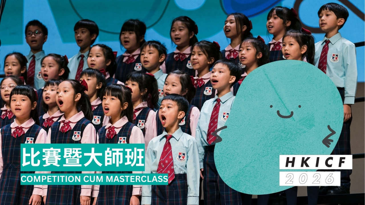 HKICF2026 Competition cum Masterclass (Vocal Ensemble / Chamber Choir Division) – Primary School Junior Division Group L 28 January, 2026 14:30 - 16:00 Theatre, Sheung Wan Civic Centre To be announced Details The event will start at 2:30 PM, and will end at around 4:00 PM. Check-In Time: 2:00 PM Rules & Regulations / FAQs Presenters Presenter Order of appearence Evangel College School Junior Choir Team 播道書院初級合唱團HHCKLA Buddhist Wisdom Primary School Junior Choir 香海正覺蓮社佛教正慧小學初級合唱團TWGHs Hong Kong and Kowloon Electrical Appliances Merchants Association Limited School Choir 東華三院港九電器商聯會小學合唱團G.T. (Ellen Yeung) College Sing 1 Sing Ambassador 優才(楊殷有娣)書院 Sing 1 Sing 合唱大使 Last Update: 2025-11-13 17:30:25 Other Events Concerts 31/01/2026 20:00 HKICF2026 Opening Showcase Concert Concerts 25/05/2026 15:00 HKICF2026 Guest Choir of the Year Concert – USC Thornton Chamber Singers Concerts 08/02/2026 15:00 HKICF2026 Guest Choir of the Year Concert – Little Skylark Children’s Choir See Full Event List