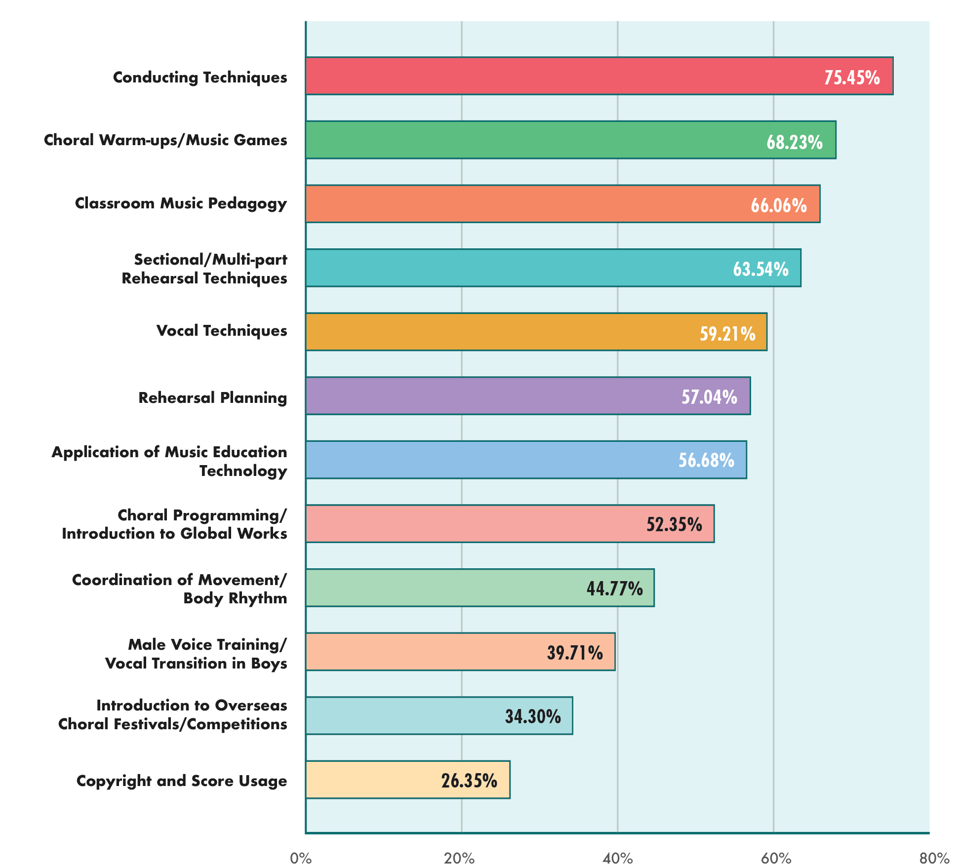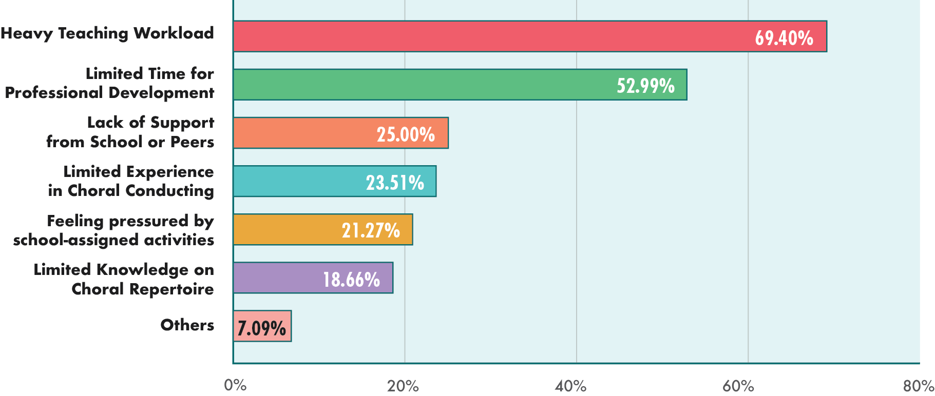 Nearly 70% of surveyed music teachers reported that heavy teaching workloads hinder their ability to focus adequately on choir training. In addition, teachers’ professional development interests closely align with the challenges they face. The responses indicated a strong demand for practical and instructional skill enhancement within the choral education community.