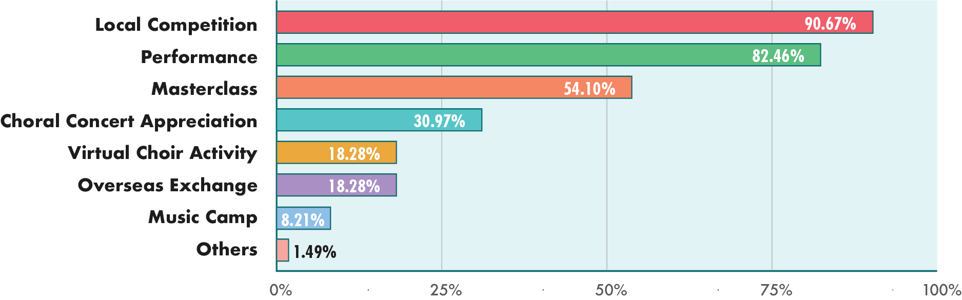 Hong Kong exhibits a notably high density of school-based choral activity. According to the survey, roughly 10% of the school-aged population (ages 6 to 18) attend regular choral training at school. Due to time constraints, annual repertoire coverage of the majority surveyed schools is generally limited, with most choirs learning between 1–3 or 4–6 works per year. Thus, in terms of activity participation, most school choirs engage in 1–3 to 4–6 events annually. Local competitions dominate the activity landscape.