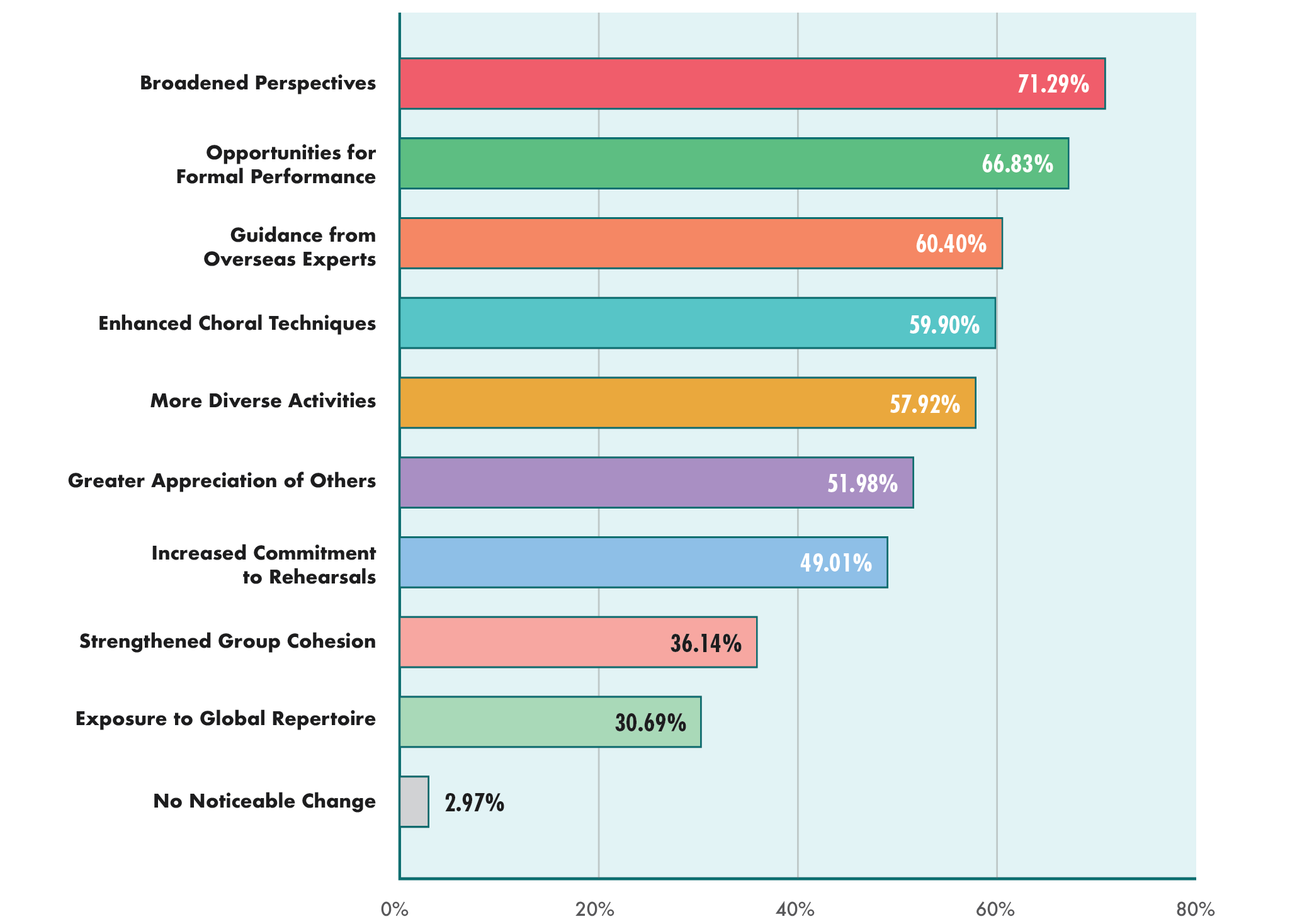 Approximately 80% of surveyed schools reported participation in HKICF. Respondents expressed highly positive evaluations of the Festival’s programmes, with students reporting significantly higher satisfaction levels than teachers. At the same time, the majority of surveyed schools reported noticeable improvements in their choirs following participation in HKICF, underscoring the Festival’s substantial and positive influence on school choir development. The findings also suggest a high level of satisfaction among participating educators regarding the quality, relevance, and practical value of the professional development opportunities provided by HKICF.